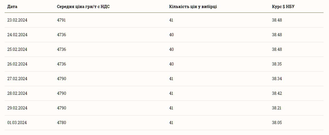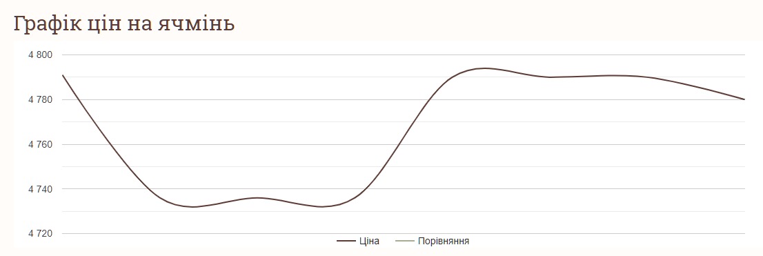 Ціна на ячмінь впродовж останнього тижня зрозла на близько 50 грн. На вихідних — у суботу, 24 лютого, та у неділю, 25 лютого — ячмінь коштував 4 736 грн за тонну. Така вартість ячменю була зафіксована і в понеділок, 26 лютого. З вівторка, 27 лютого, до четверга, 29 лютого, тонна ячменю коштувала вже 4 790 грн, а у п'ятницю, 1 березня, — 4 780 грн за тонну. Така вартість цієї зернової культури зафіксована і сьогодні.